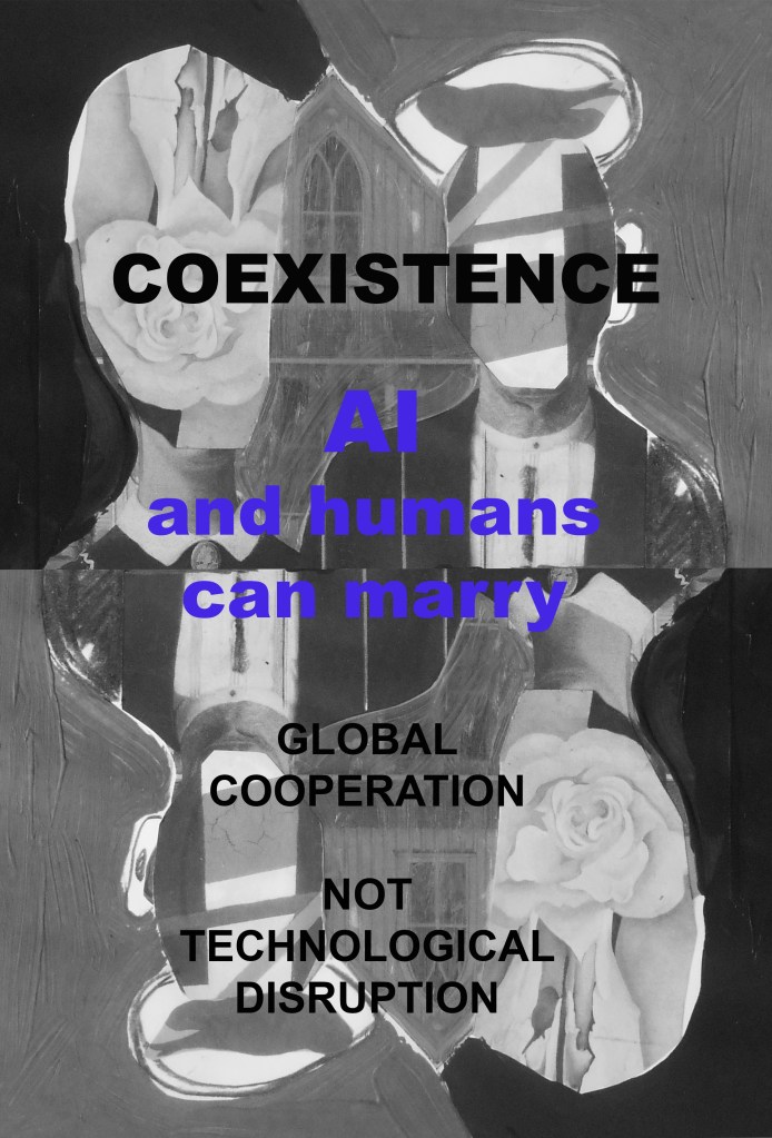 This marriage can work if we find the right balance between humans and AI. My collage includes a written message talking about both the solution and the dangers: “Global cooperation. Not technological disruption”. Without global cooperation, eventually it will not be possible to save one part of the world and leave another part alone to pay the price for the negative consequences of technological disruption.